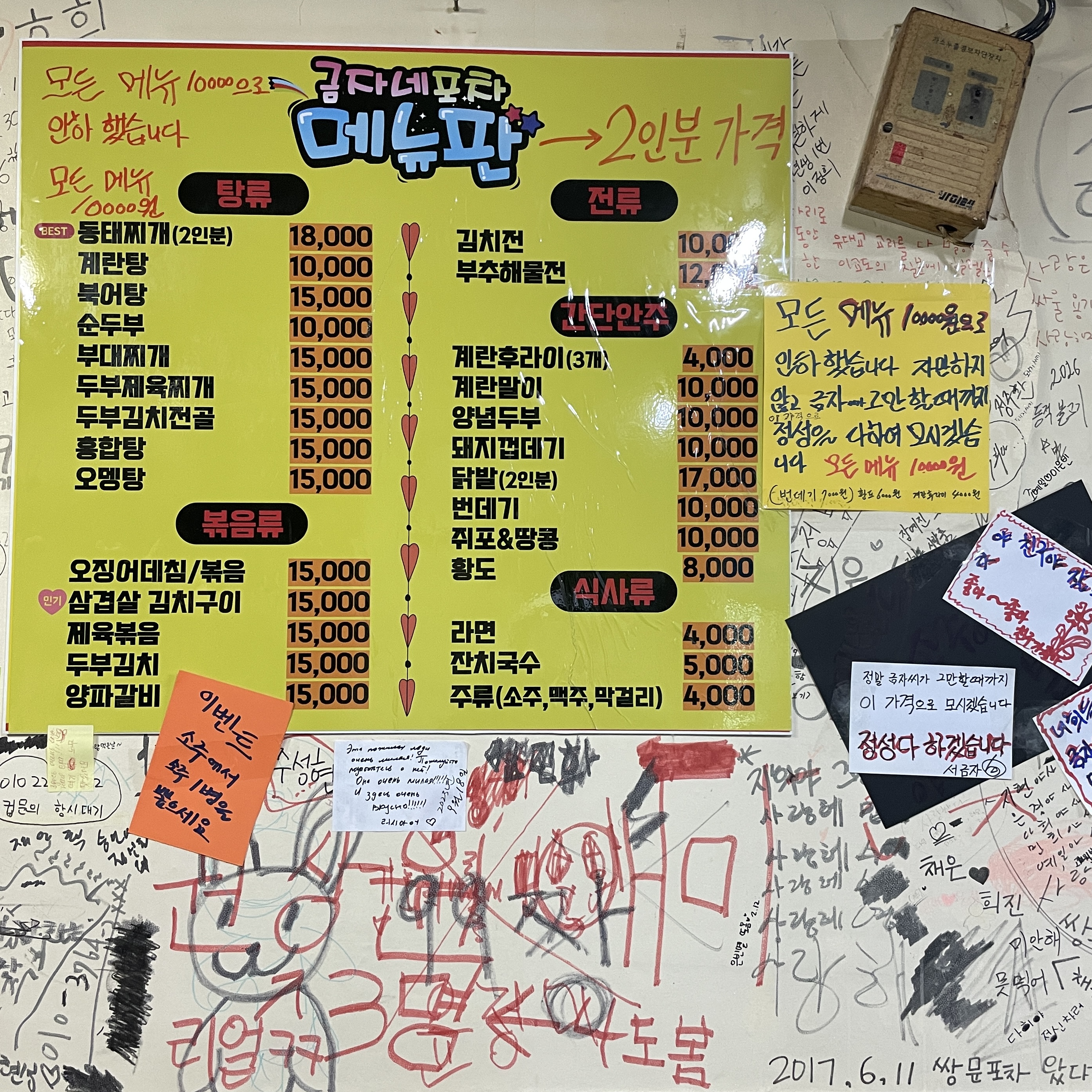 동태탕(2인분) 18,000 | 부대찌개 15,000 | 삼겹살 김치구이 15,000 | 오징어데침 15,000 | 닭발 17,000