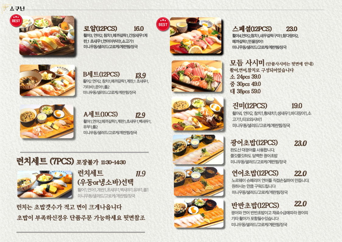쇼쿠닌 로얄 (12pcs) 16,000 | 쇼쿠닌 스폐셜 (12pcs) 23,000 | 모듬사시미 대 59,000 | 캐주얼 모듬B 13,900 | 쇼쿠닌진미 (12pcs) 19,000 | 반반초밥12PCS (활어6pcs+연어pcs6) 22,000 | 캐주모듬A 12,900 | 모듬사시미 소 중 대 39,000 | 광어초밥12pcs 23,000 | 연어초밥 (12pcs) 22,000 | 평일런치특선(우동&소바 택1) 11,900 | 캘리포니아 롤 9,800 | 연어롤 13,800 | 더블쉬림프 롤 13,800 | 어린이 초밥세트 10,500 | 어린이 유부초밥 3,800 | 어린이 계란초밥 5,000 | 어린이 새우초밥 5,000 | 수제 가츠오 우동 6,500 | 수제 가츠오 소바 6,500 | 생새우 튀김 7,000 | 일본사케 35,000 | 장어 활어 반반초밥 23,000