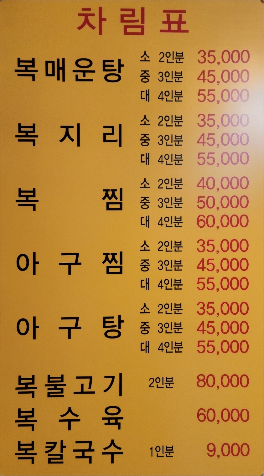 아구찜/아구탕 小 35,000 | 아구찜/아구탕 中 45,000 | 아구찜/아구탕 大 55,000 | 복매운탕/복지리 小 35,000 | 복매운탕/복지리 中 45,000 | 복매운탕/복지리 大 55,000 | 복찜 小 40,000 | 복찜 中 50,000 | 복찜 大 60,000 | 복수육 60,000 | 복불고기(2인분이상) 80,000 | 복칼국수 9,000